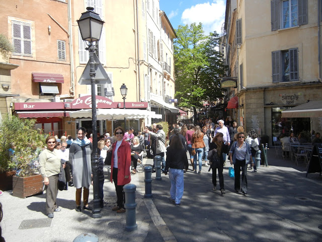 Our first stop was in Aix-en-Provence, a small city that during the Middle Ages was the capital of Provence. We headed straight for the Cours Mirabeau, the wide and beautiful main avenue in the old part of Aix planted with double rows of Plane trees and decorated by four fountains, two in the middle and one at each end. At one end is La Rotonde, at the Place du General de Gaulle, with its beautiful round fountain; at the other end is Place Forbin, with its small fountain and statue of King René I of Anjou. We stopped for some refreshments and to enjoy the sunny morning at a quaint café facing Place du General de Gaulle.